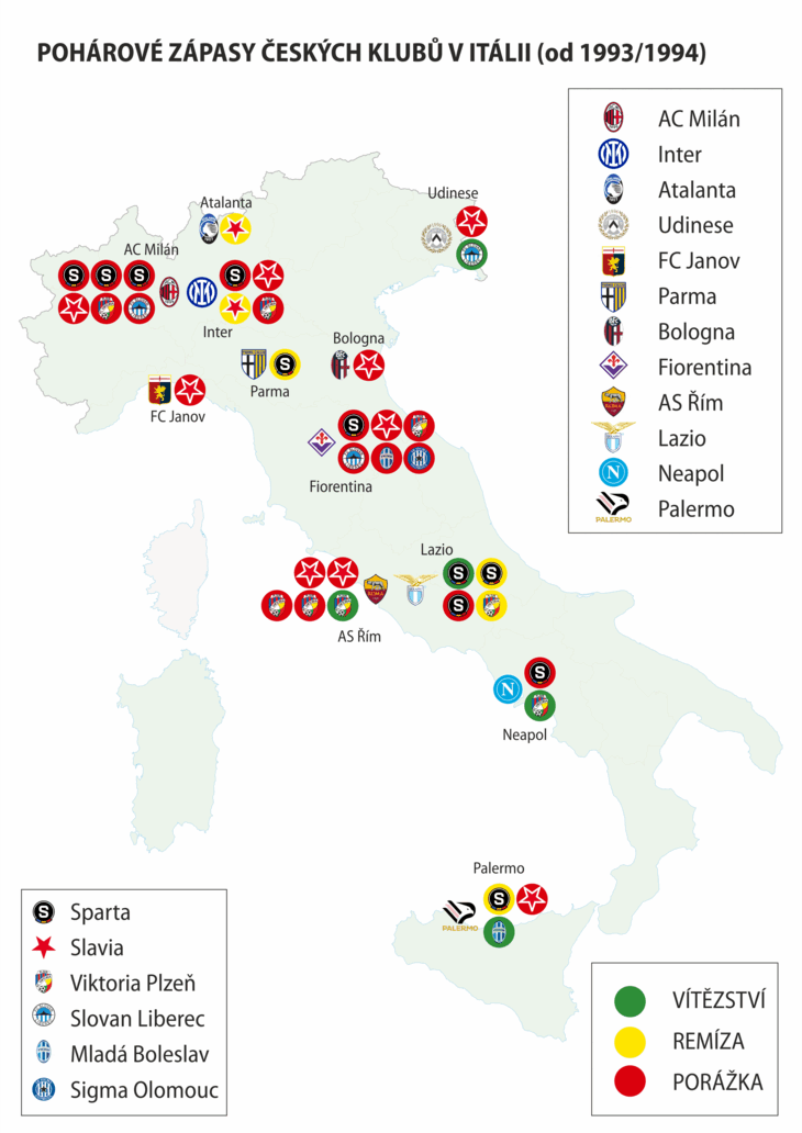Nejvíce utkání odehrály české kluby ve Florencii (0-0-6) a na San Siru proti AC (0-0-6). Prvního vítězství jsme se díky Plzni dočkali na Stadio Olimpico proti AS (1-0-4). Nějaký ten bod dokázaly české kluby vybojovat na hřišti Interu (0-1-3), Palerma (1-1-1), Lazia (1-2-1), Neapole (1-0-1) či Udinese (1-0-1). Sparta má ze zápasů na hřišti italských soupeřů bilanci 1-3-7, Slavia 0-2-9 a Plzeň 2-1-5.