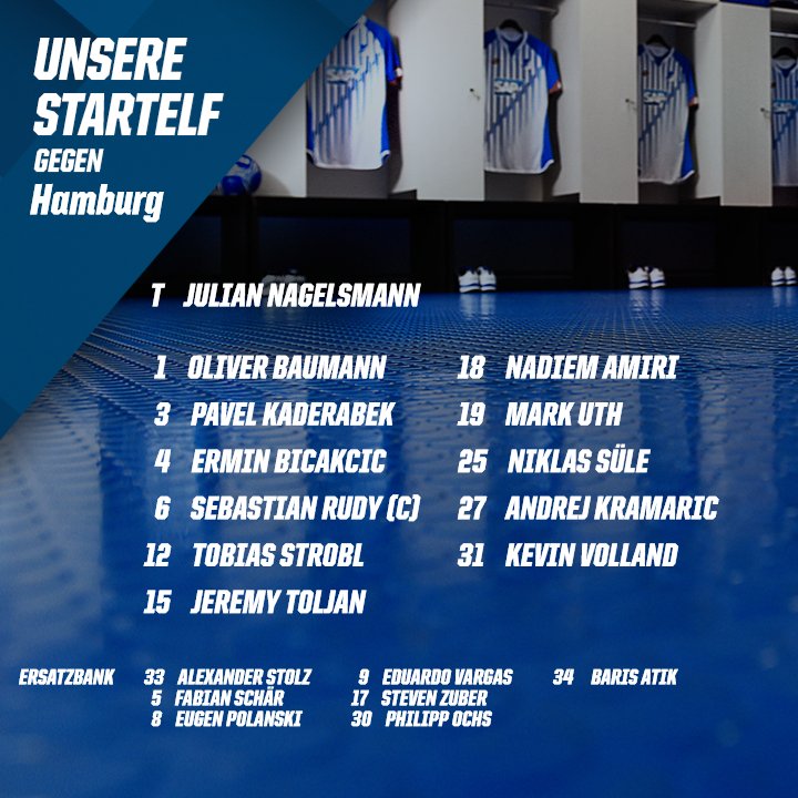 Adler - G. Sakai, Spahic, Cleber, Ostrzolek - Ekdal, Holtby - Gregoritsch, Hunt, Ilicevic - Rudnevs TSG Hoffenheim - pravděpodobná sestava: