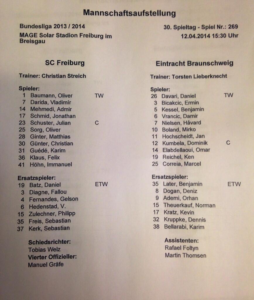 Christian Streich a jeho ovečky by tak rádi navázali na poslední úspěšná vystoupení před vlastními fanoušky (vítězství nad Brémami a Norimberkem). "Oproti poslednímu zápasu na hřišti Stuttgartu se musíme zlepšit," nepochybuje Streich. "Braunschweig během posledních týdnů získal hodně bodů a rozhodně to nebylo nezaslouženě," přidává varování Matthias Ginter, který dementoval údajný přestup do Borussie Dortmund. "Není to pravda," řekl. "Nabídku od BVB jsme opravdu nedostali," dodal sportovní ředitel Jochen Saier.