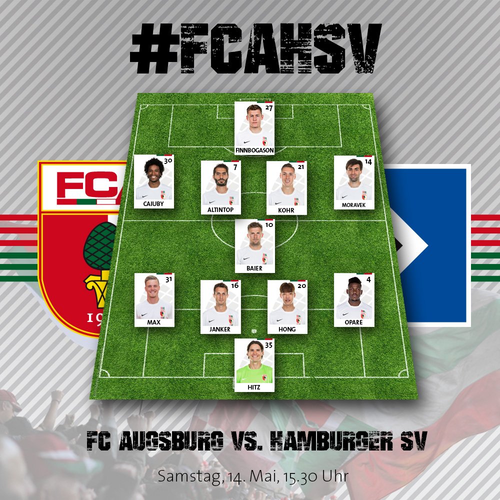 FC Augsburg - pravděpodobná sestava:Slavné hodiny na Volksparkstadionu tedy budou nadále ukazovat čas strávený v Bundeslize, který trvá už od jejího založení v roce 1963. HSV sice prohráli s Wolsburgem, nicméně děkovat mohou losu, že určil, že v poslední hrací den se utkají Werder Brémy a Eintracht Frankfurt. Jinak by byl klub z přístavního města do té sestupovo-barážové šlamastiky stále namočený.