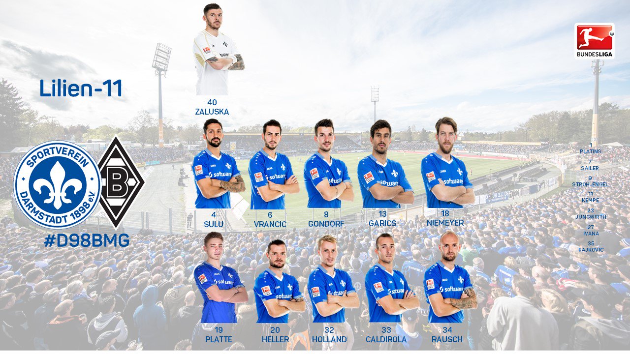 Na druhé straně chybí Jan Rosenthal, Slobodan Rajković, brankář Christian Mathenia a útočník Sandro Wagner, jenž tedy sezonu zakončí na čtrnácti přesných trefách, což je vskutku úctyhodný výsledek. Mezi tři tyče se v dresu Die Lilien postaví debutující Lukasz Zaluska, za Rajkoviće naskočí Fabian Holland a Wagnera se pokusí alespoň částečně nahradit buď Dominik Stroh-Engel, nebo Felix Platte.