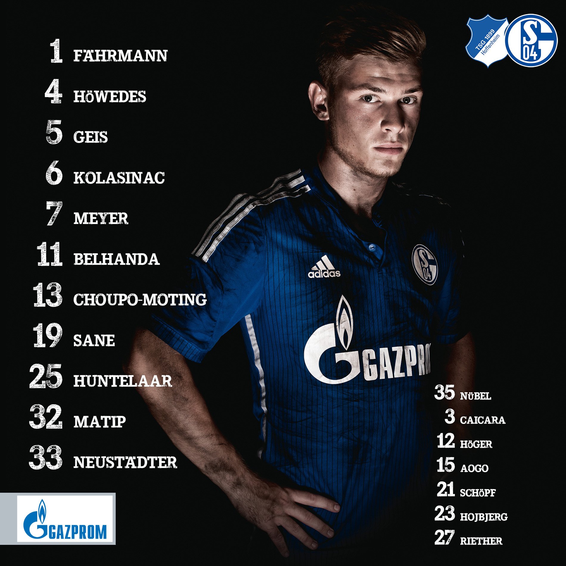 Fährmann - Junior Caicara, Höwedes, J. Matip, Kolasinac - Geis, Höjbjerg - L. Sané, M. Meyer, Choupo-Moting - Huntelaar Kurzy sázkové kanceláře bet365: 2.90 - 3.80 - 2.25 Tip EuroFotbal.cz: 10 více informací