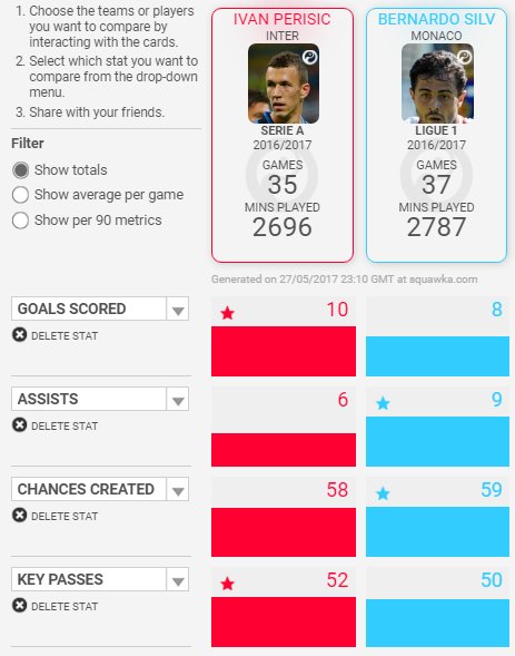 kdyz kasles na statistiky, tak dle ceho to chces posuzovat? Silva ma skvelou techniku a herni inteligenci, jak pises, a Perisic i kdyz je v tomhle spis horsi v porovnani se Silvou, tak dokazal pripravit stejne mnozstvi golu pro svuj tym. To mi taky neprijde spatny.