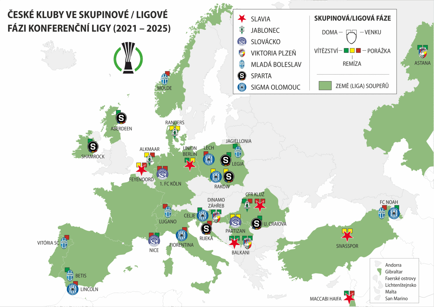 Hlavní fáze soutěže se zúčastnili zástupci již 48 z celkových 55 členů UEFA. Nejčastějšími účastníky (celkem 8) jsou týmy z Belgie, Česka, Polska a Kypru. Z českých klubů se o postup úspěšně popraly Slavia (2021), Plzeň (2023) a letos i Sparta se Sigmou. Další čtyři účasti skončily neúspěchem. V případě Jablonce (2021), Slovácka (2022) a Mladé Boleslavi (2024) šlo o relativně očekávaný výsledek, zklamáním bylo vyřazení Slavie (2022).