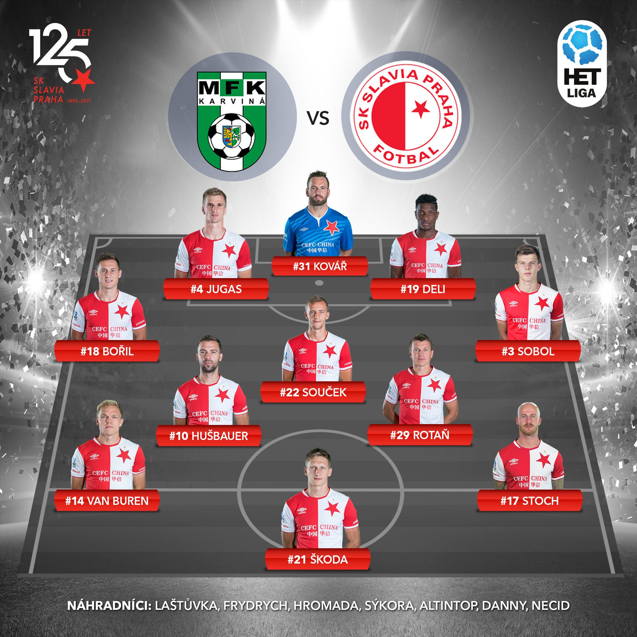 Laštůvka - Bořil, Jugas, Deli, Sobol - Ngadeu - Sýkora, Hušbauer, Stoch, Danny - Škoda. Kurzy sázkové kanceláře Tipsport: 6.26 - 4.16 - 1.59 Tip EuroFotbal.cz: 2 více informací