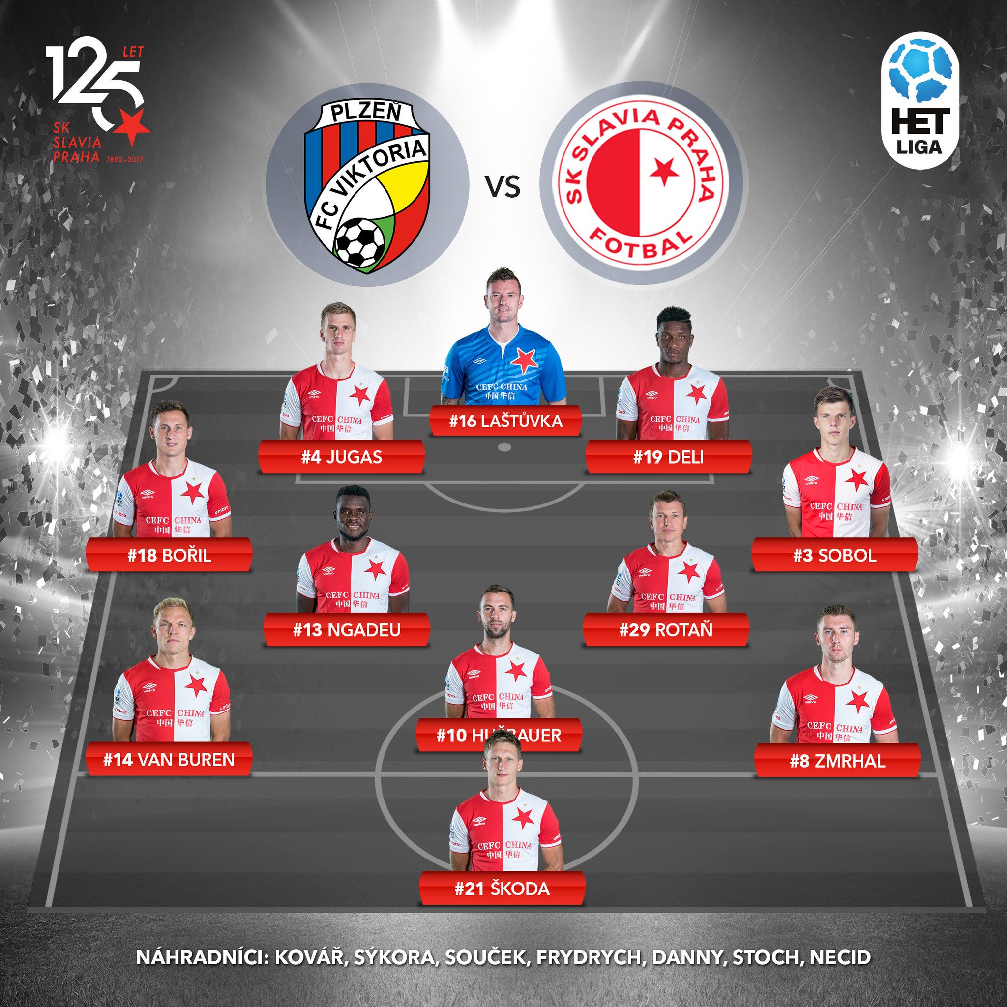 Laštůvka - Bořil, Deli, Jugas, Sobol - Souček, Ngadeu - Van Buren, Hušbauer, Stoch - Škoda. Kurzy sázkové kanceláře Tipsport: 2.22 - 3.37 - 3.60 Tip EuroFotbal.cz: 0 více informací