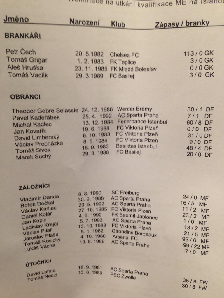 Zkusil bych : Čech - Kadeřábek, Sivok, Suchý, Limberský - Darida, Vácha, - Dočkal, Rosický, Kopic - Lafata... Kadlece místo Rosy, až by se zranil někde v 60. minutě.