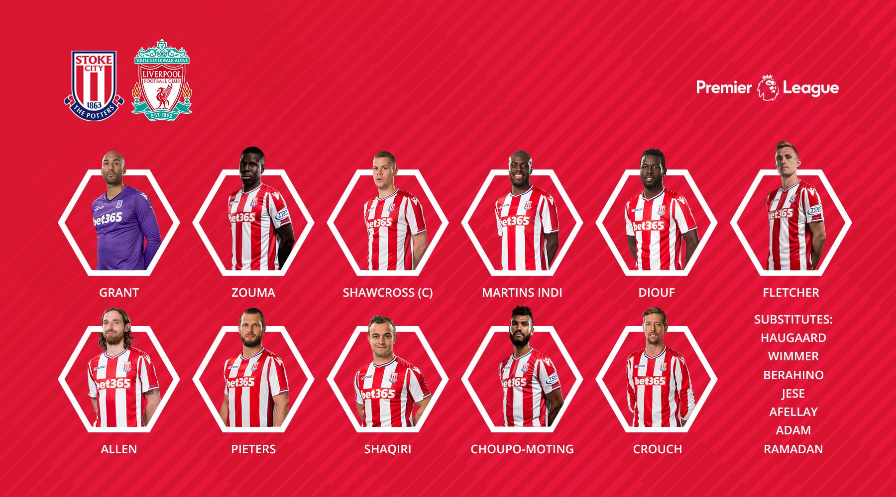 Grant - Zouma, Shawcross, Wimmer - Diouf, Fletcher, Allen, Pieters - Shaqiri, Jesé - Choupo-Moting Liverpool FC - pravděpodobná sestava: