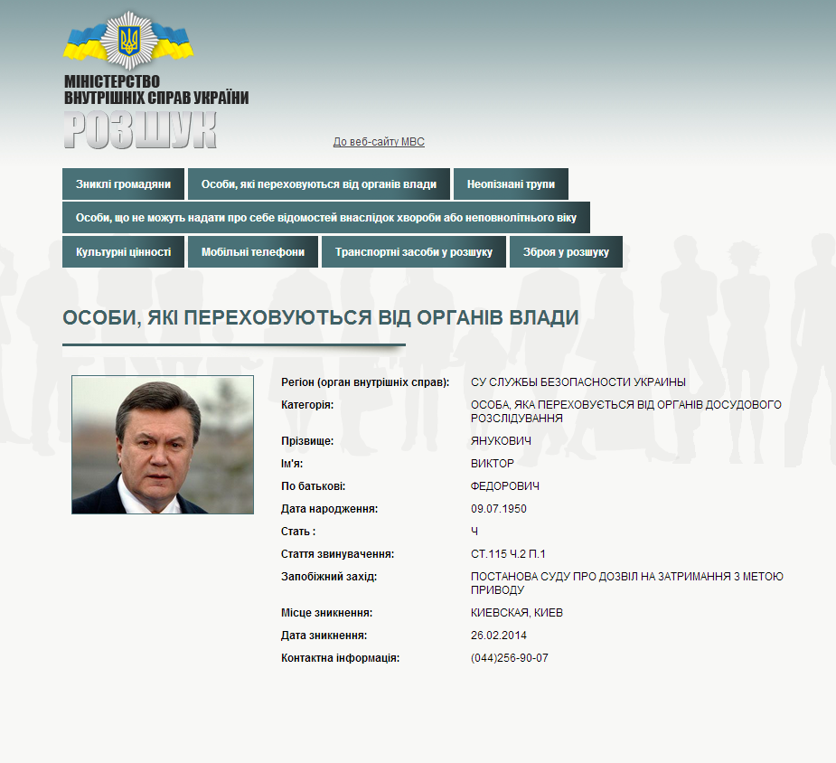 Yanukovych's "wanted" profile is on Ukraine's Interior Ministry website now.