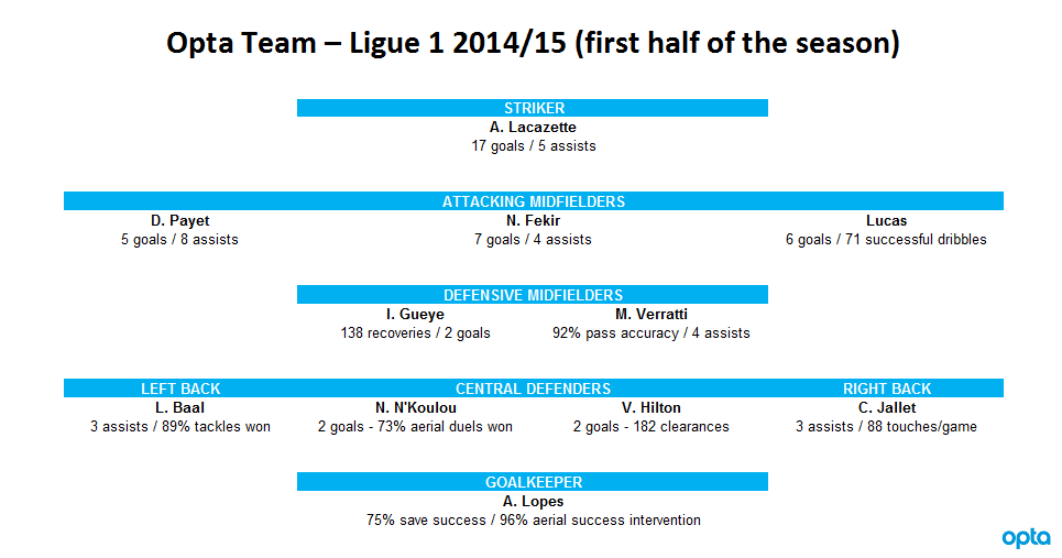 Stéphane Ruffier (Saint-Étienne) - Christophe Jallet (Lyon), Papy Mison Djilobodji (Nantes), Florentin Pogba (Saint-Étienne), Jordan Amavi (Nice) - Maxime Gonalons (Lyon), Giannelli Imbula (Marseille) - Lucas Moura (PSG), Dimitri Payet (Marseille), Yannick Ferreira-Carrasco (Monaco) - Alexandre Lacazette (Lyon). Trenér: Marcelo Bielsa (Marseille).