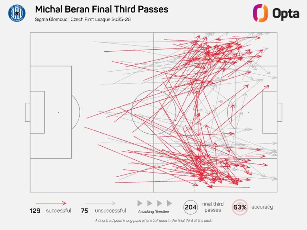 Nejlépe to dokumentuje mapa přihrávek s adresátem v závěrečné třetině hřiště. Zatímco v ligových zápasech z hloubi pole pravidelně rozdává dlouhé průnikové pasy na rozběhnuté spoluhráče, v Konferenční lize při přechodu často volí jednodušší řešení v podobě kratších přihrávek do stran.