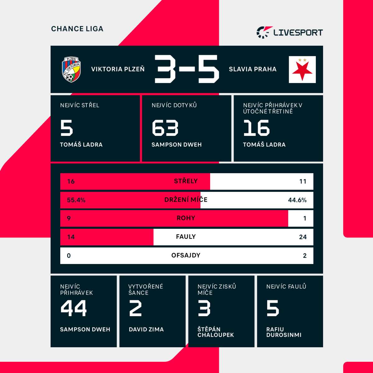 Nicméně jasný signál vydali slávisté, kteří už výkonem proti Arsenalu vykázali znatelný posun co se týká intenzity, bojovnosti a zápalu. Oproti derby, kdy dohrávali v deseti, se v Plzni také rapidně zlepšili v soubojích. Zatímco na Letné měli úspěšnost v obranných duelech pouhých 61 %, ve Štruncových sadech to bylo 92 %.