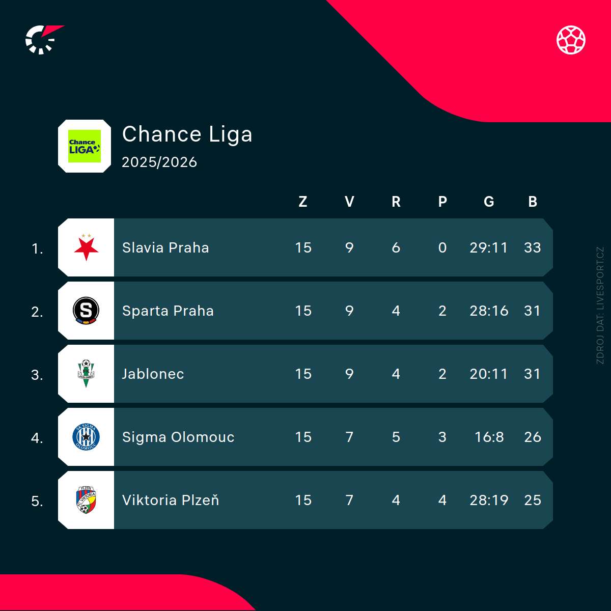 Prvních pět míst v tabulce Chance Ligy (©Livesport)