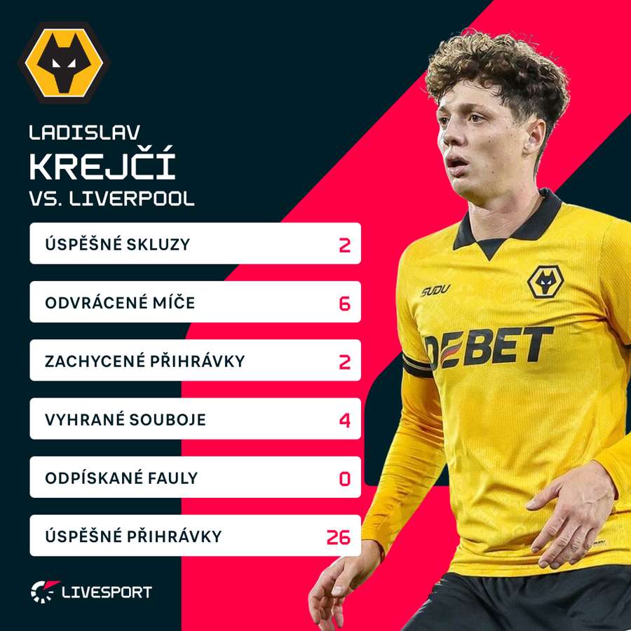 Pozor, Wolves to ještě nevzdali! Druhé vítězství v řadě dává téměř beznadějně poslednímu Wolverhamptonu naději, že ještě udrží příslušnost v Premier League i pro následující sezonu. Po skalpu Liverpoolu má klub z Molineaux ztrátu na 17. příčku už "jen" 12 bodů. A po úterním utkání se hodně mluví i o výkonu Ladislava Krejčího (26), který ve zmíněném zápase svedl spoustu soubojů s Mohamedem Salahem.