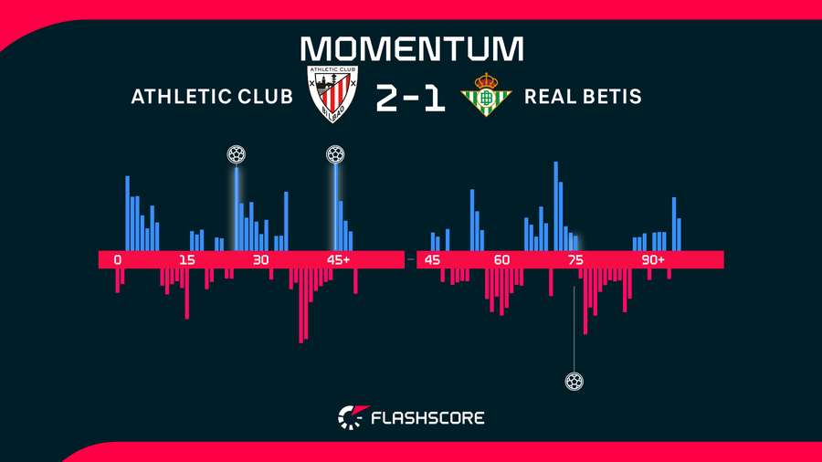 Betis sice před pár dny v Evropě rozstřílel Panathinaikos, v Bilbau ale působil bezzubě. Frustrace trenéra Manuela Pellegriniho se prohloubila těsně před přestávkou. Iňaki Williams znovu skvěle načasoval náběh, vyhnul se ofsajdové pasti a předložil míč Sancetovi, který do prázdné brány zvýšil na 2:0. Pro Athletic to bylo teprve podruhé z posledních 15 ligových zápasů, kdy šel do kabin s náskokem.