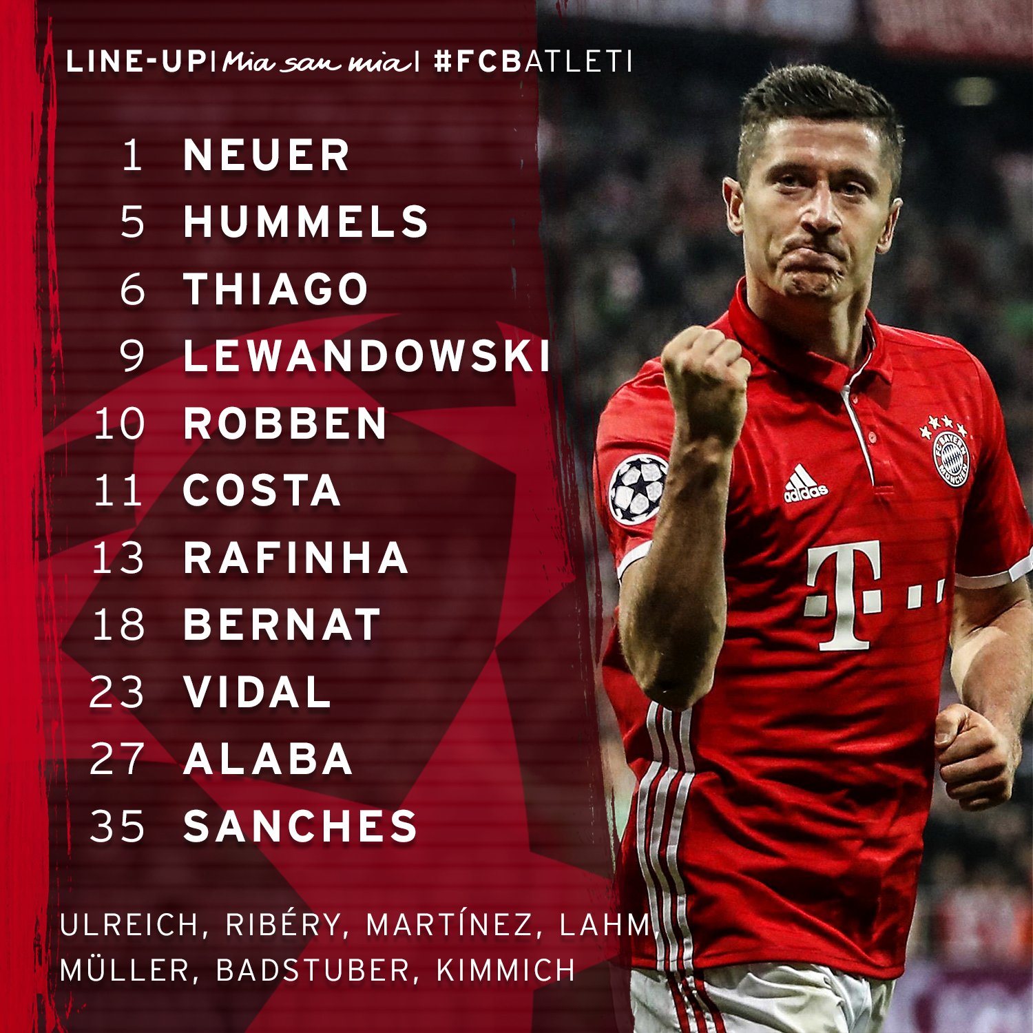 Neuer – Hummels, Thiago, Lewandowski, Robben, Costa, Rafinha, Bernat, Vidal, Alaba, Sanches