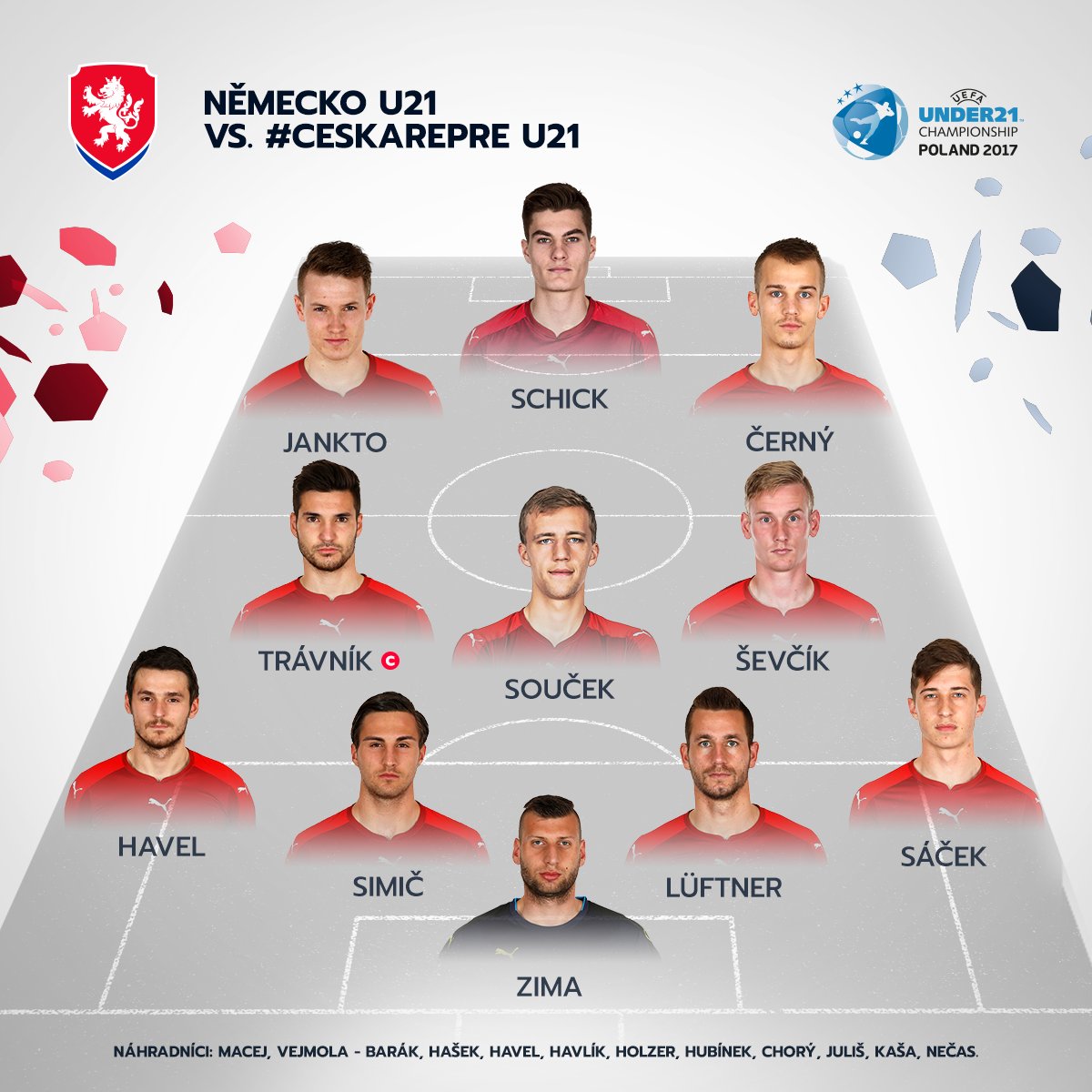 Zima - Matějů, Lüftner, Simić, Havel - Souček - Černý, Barák, Trávník, Jankto - Schick