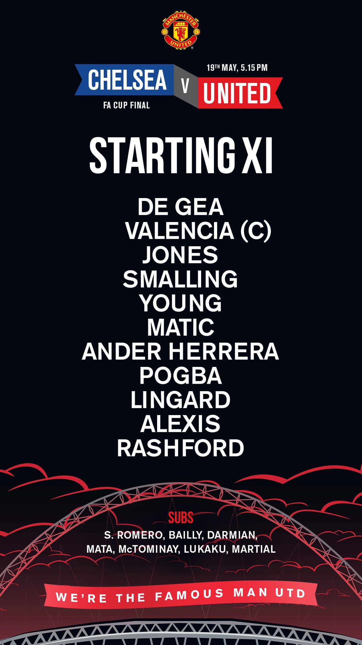 De Gea - Valencia, Smalling, Jones, Young - Herrera, Matić, Pogba - Lingard, Lukaku (Rashford), Alexis Sánchez